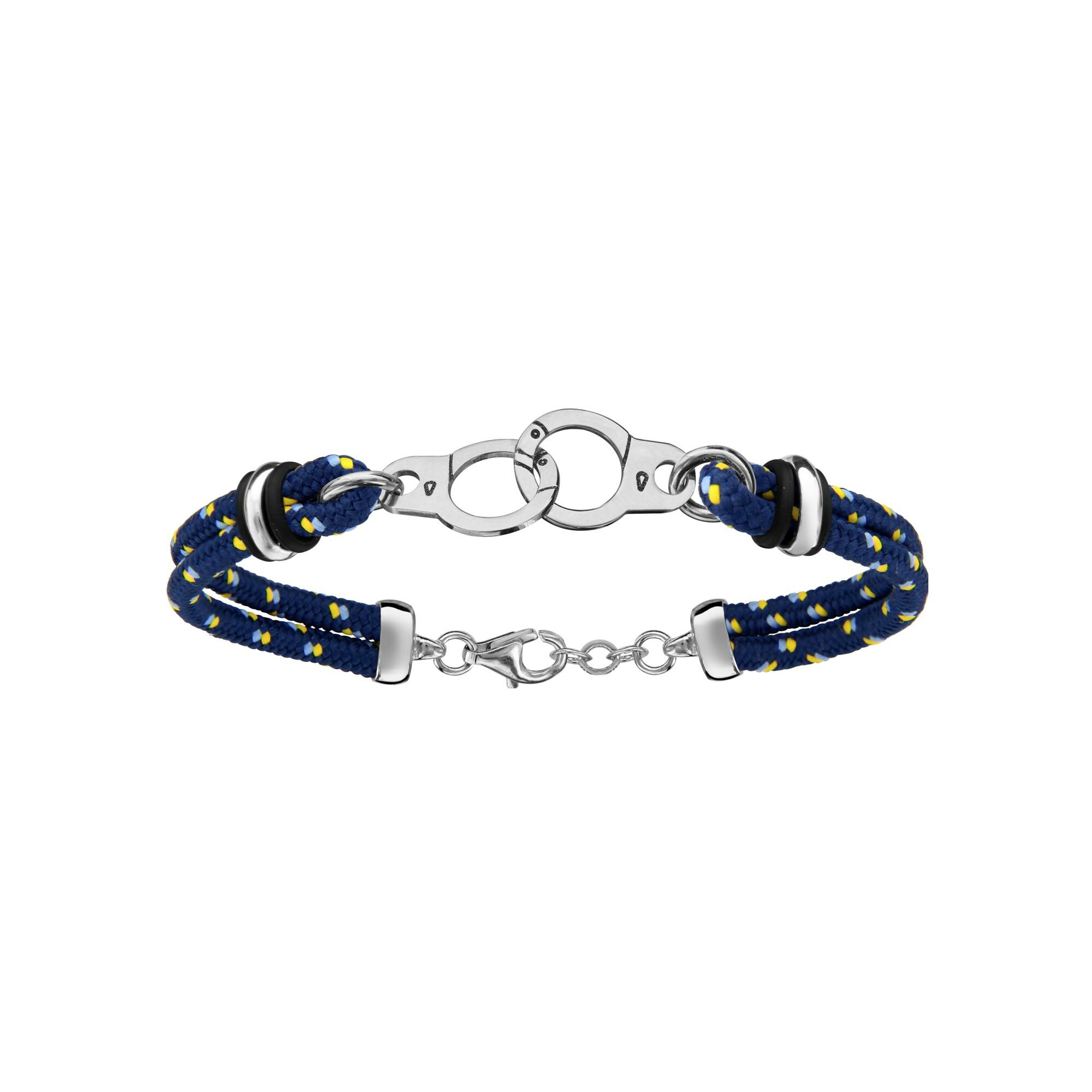 Bracelet argent rhodié 2 rangs corde bleu et jaune menottes 18+4cm