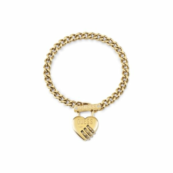 Bracelet Guess Lock Me Up en acier doré, forme cadenas coeur, fermoir T et logo GUESS