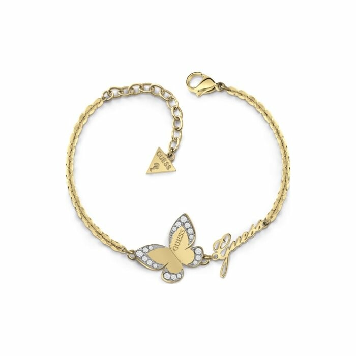 Bracelet Guess Love Butterfly en acier et cristaux Swarovski, chaîne avec logo GUESS et papillon
