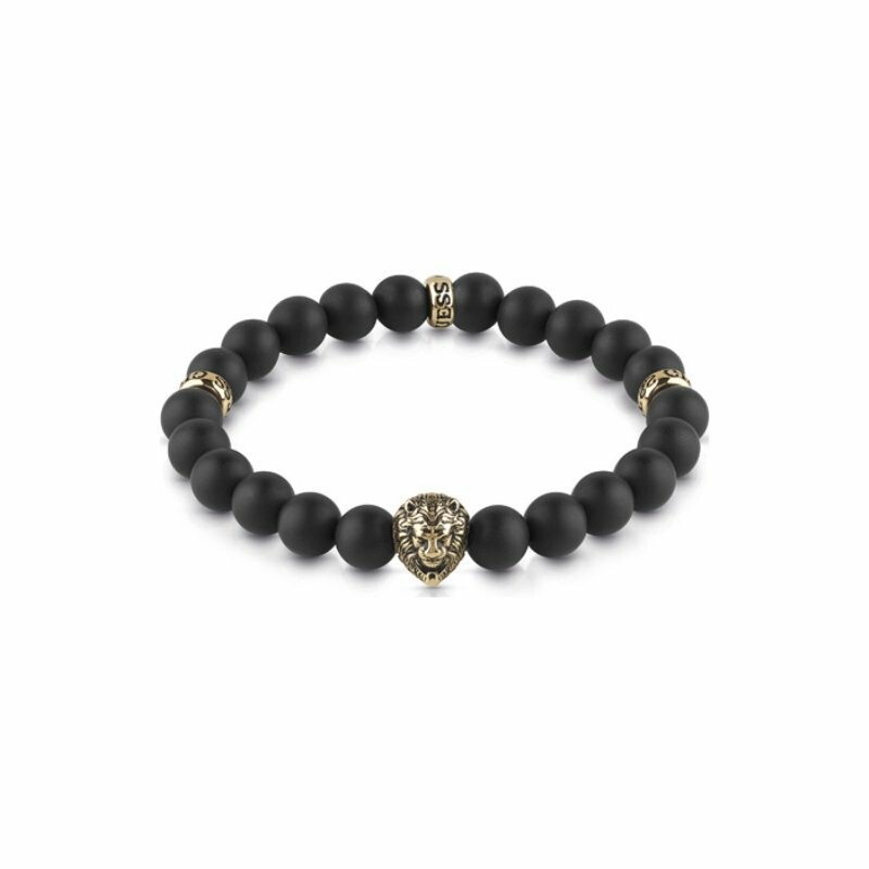 Bracelet Guess Men In Guess en perles noires et détails acier doré, forme tête de lion et logo GUESS