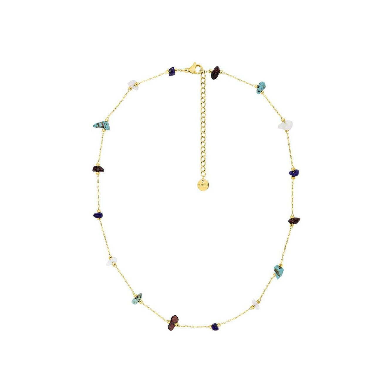 Collier en acier doré, œil de tigre, turquoise et agate et lapis lazuli