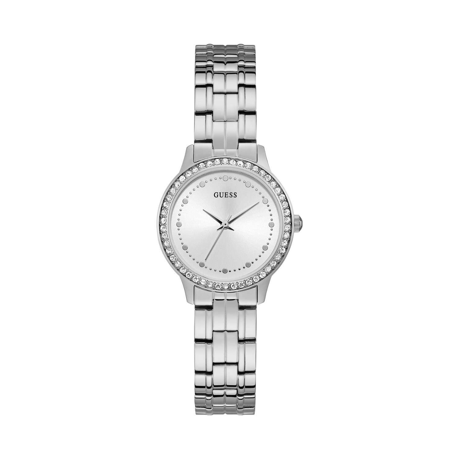 Boîtier acier brillant avec cristaux, cadran argenté, bracelet acier brillant, étanche jusqu'à 30 mètres (3 ATM).