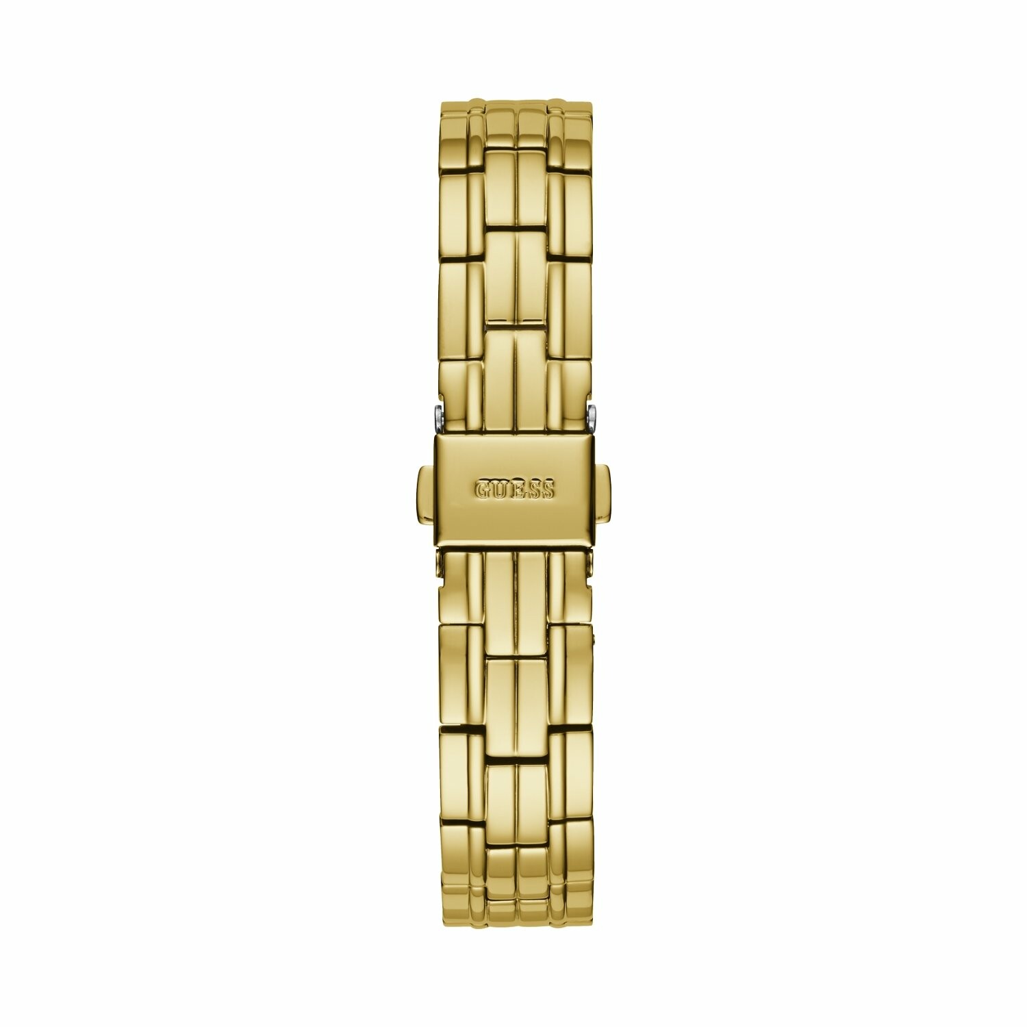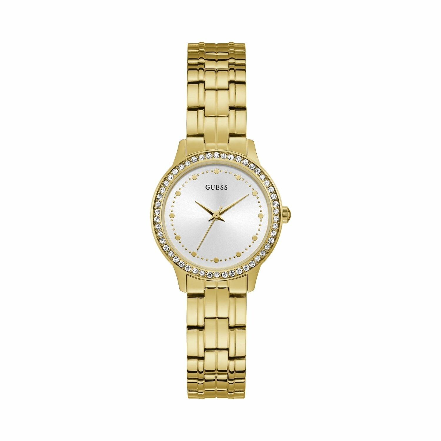 Boîtier acier doré brillant avec cristaux, cadran blanc, bracelet acier doré brillant, étanche jusqu'à 30 mètres (3 ATM).