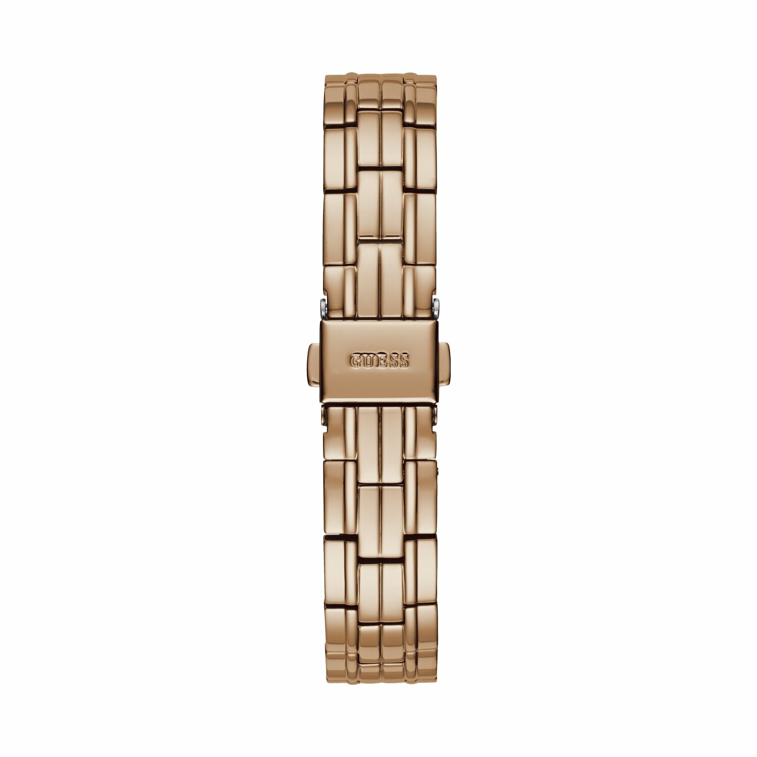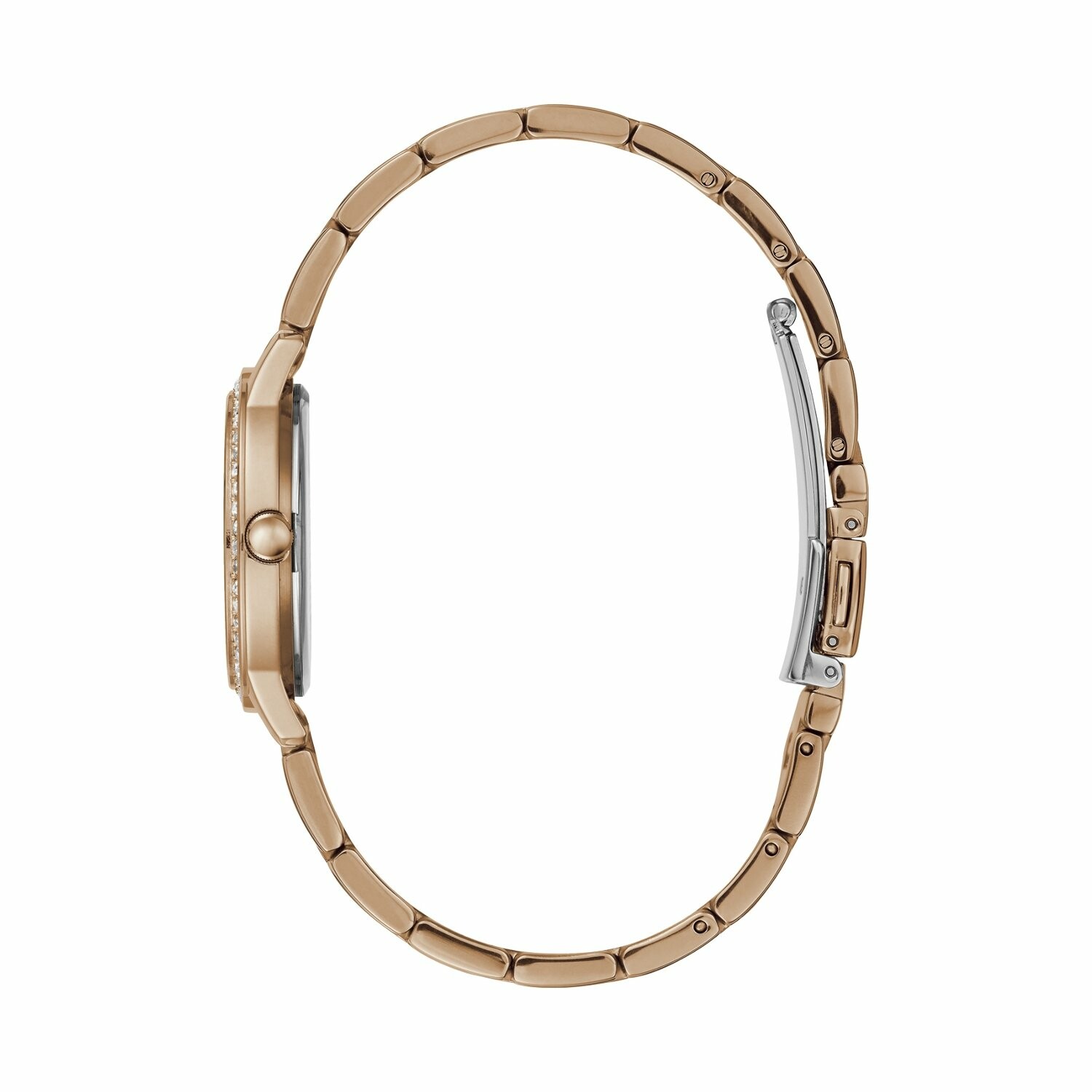 Boîtier acier doré rose brillant avec cristaux, cadran blanc, bracelet acier doré rose brillant, étanche jusqu'à 30 mètres (3 ATM).