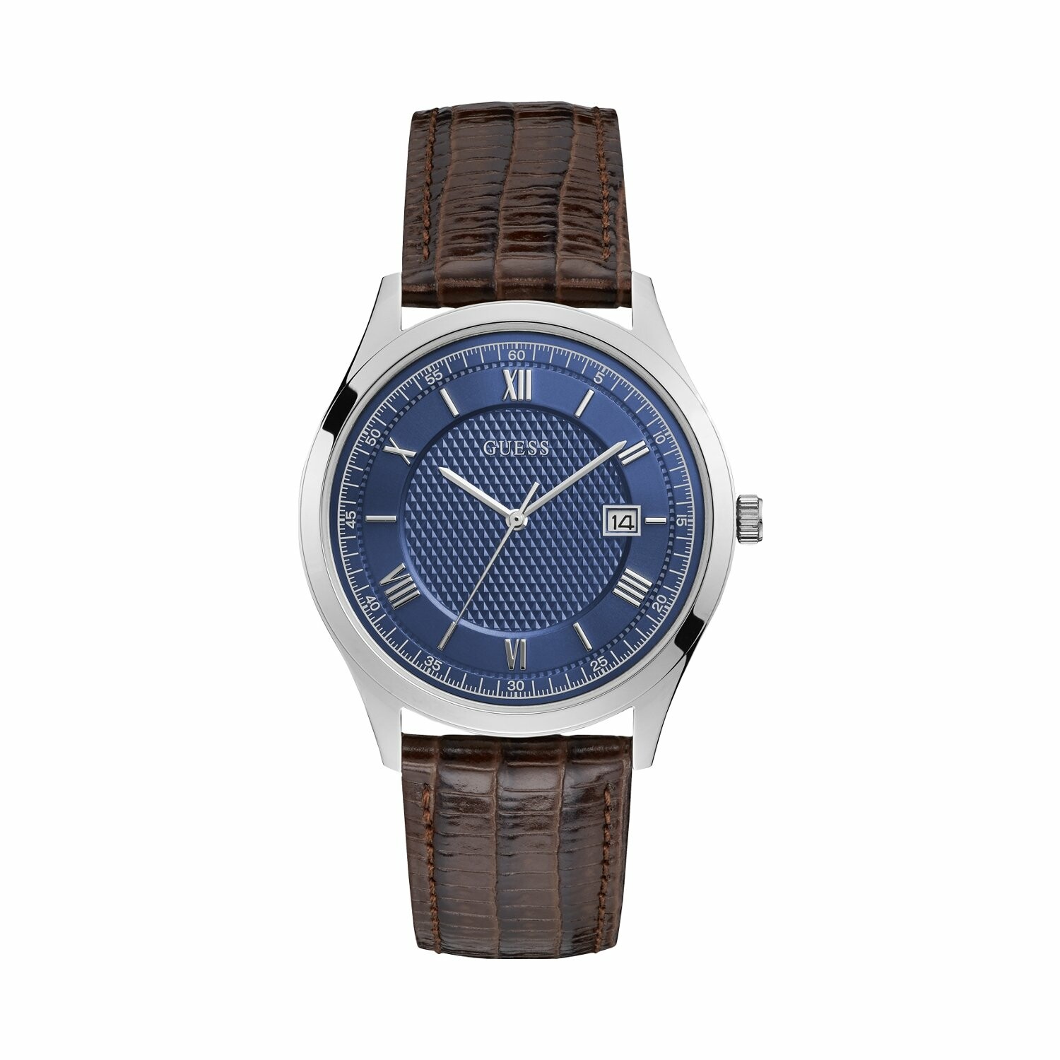 Boîtier acier brillant, cadran bleu, dateur, bracelet cuir marron façon lézard, étanche jusqu'à 30 mètres (3 ATM).