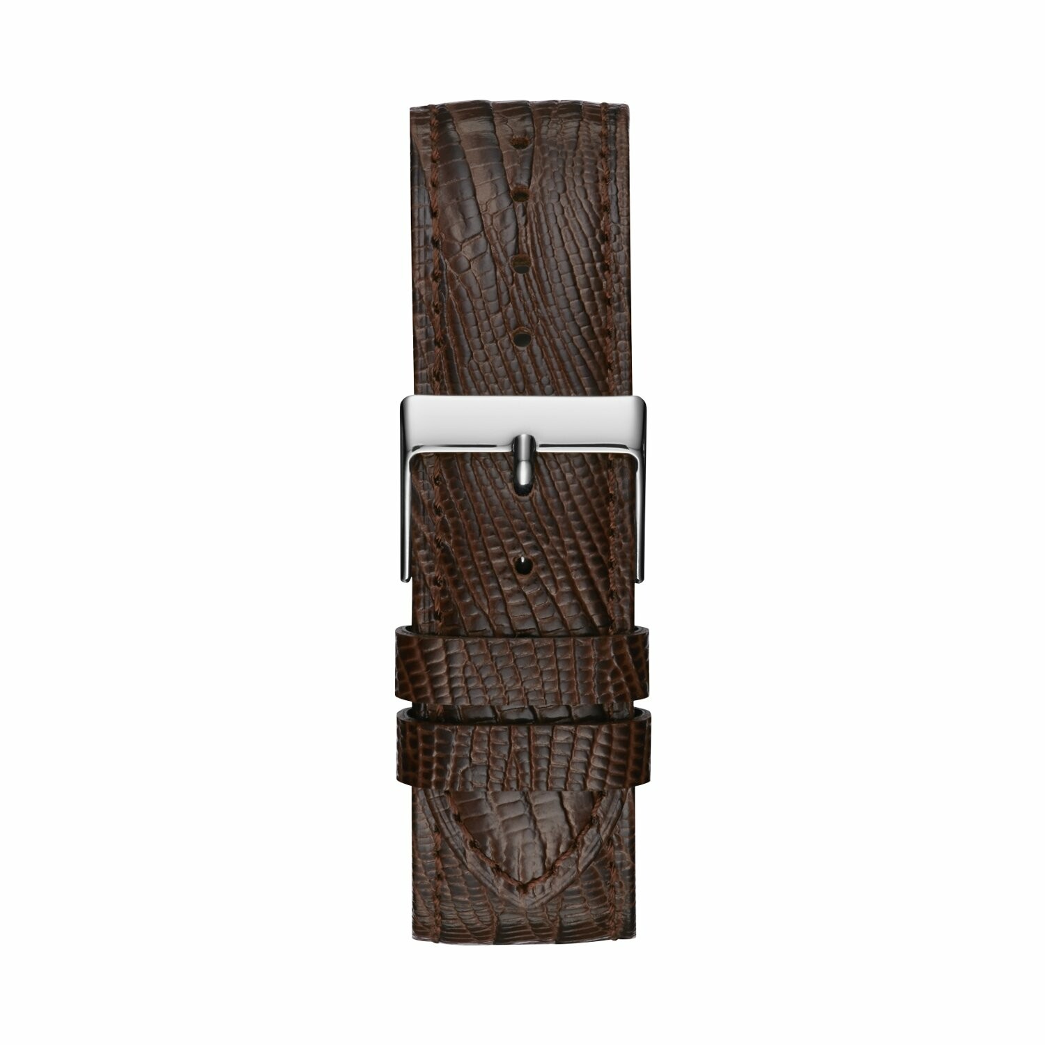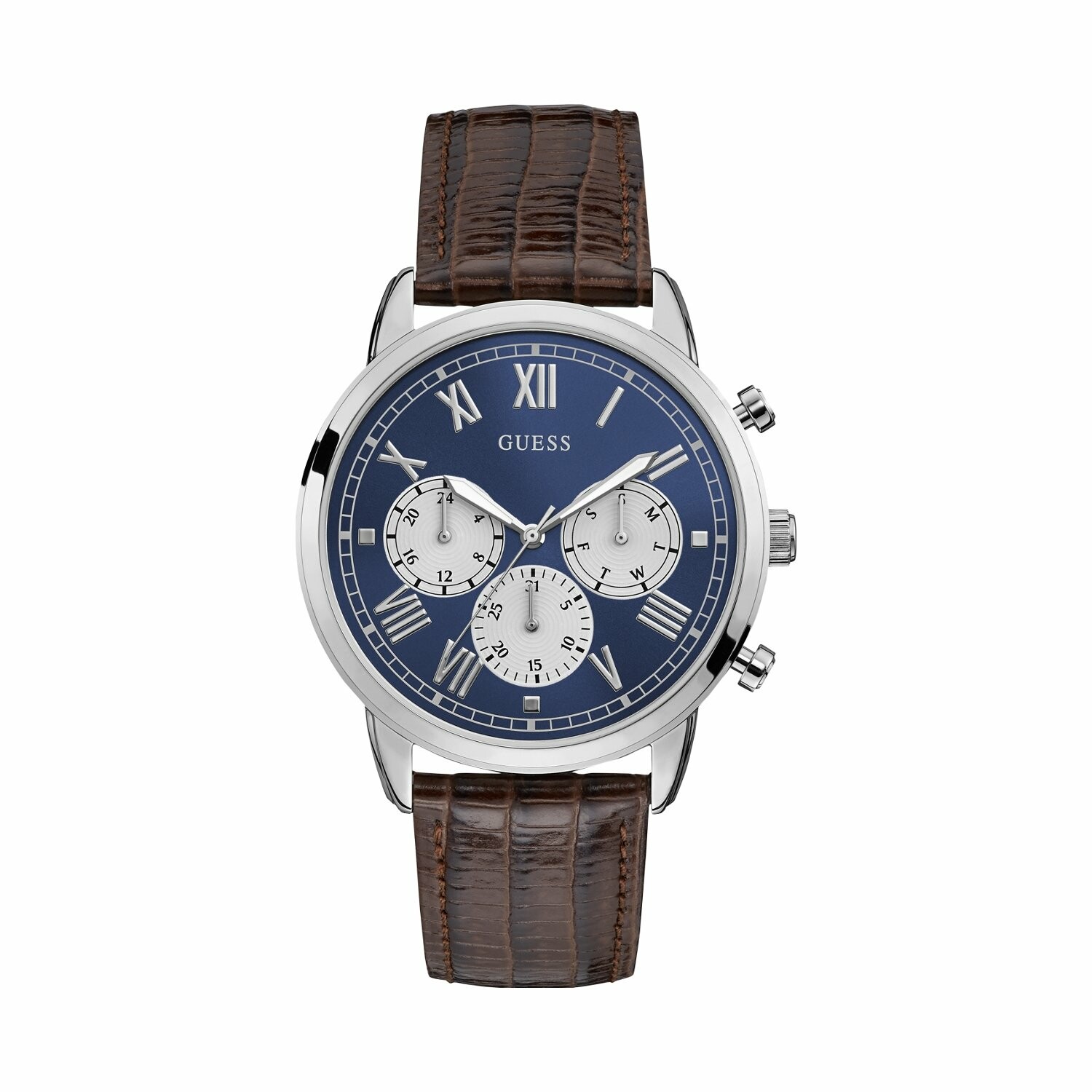 Boîtier acier brillant, cadran bleu, multifonction façon chrono, bracelet cuir marron façon lézard, étanche jusqu'à 50 mètres (5 ATM).