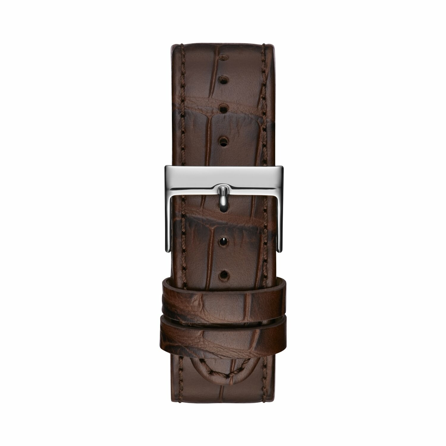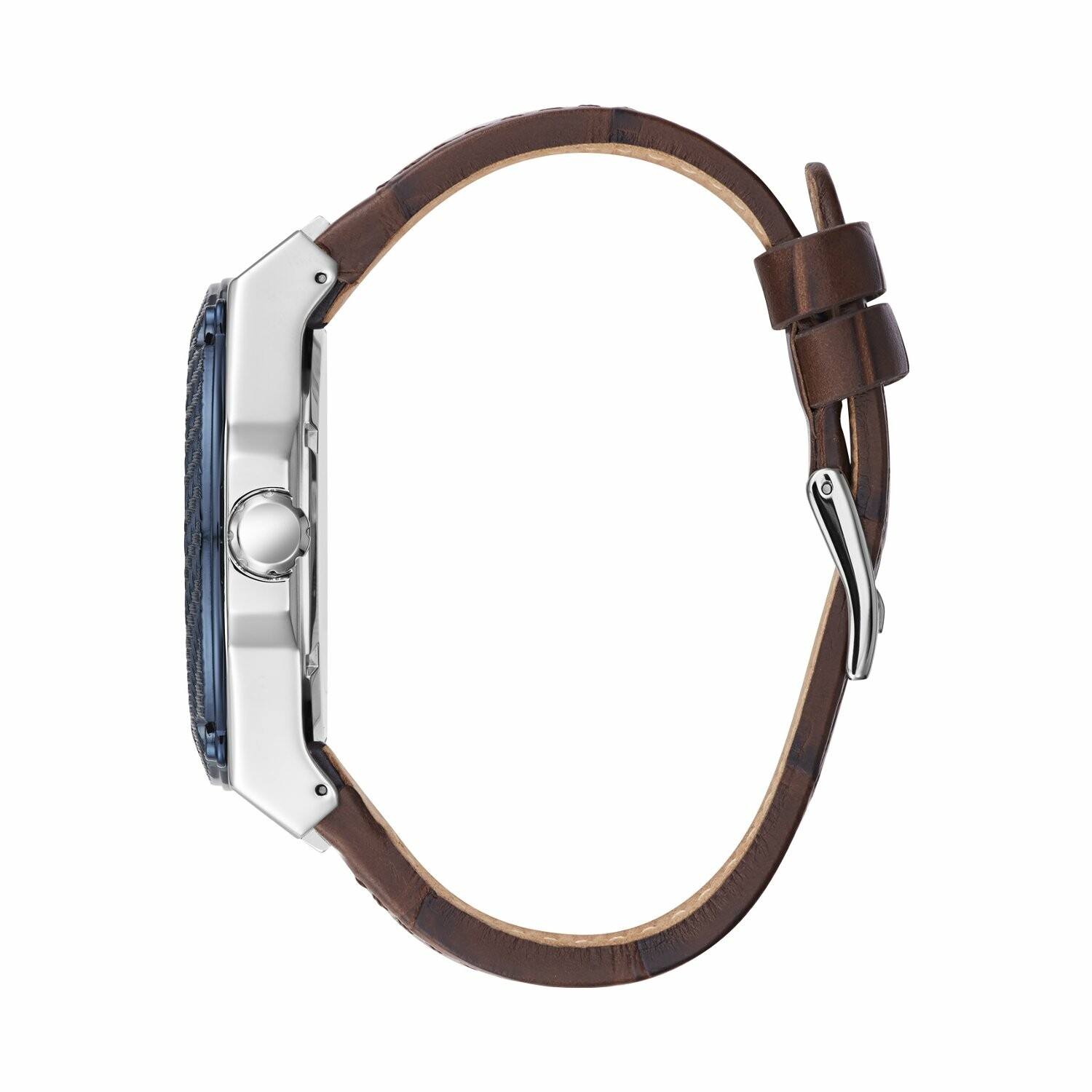 Boîtier acier IP brillant, lunette bleue, cadran bleu texturé, multifonction, bracelet cuir marron façon croco, étanche jusqu'à 100 mètres (10 ATM).