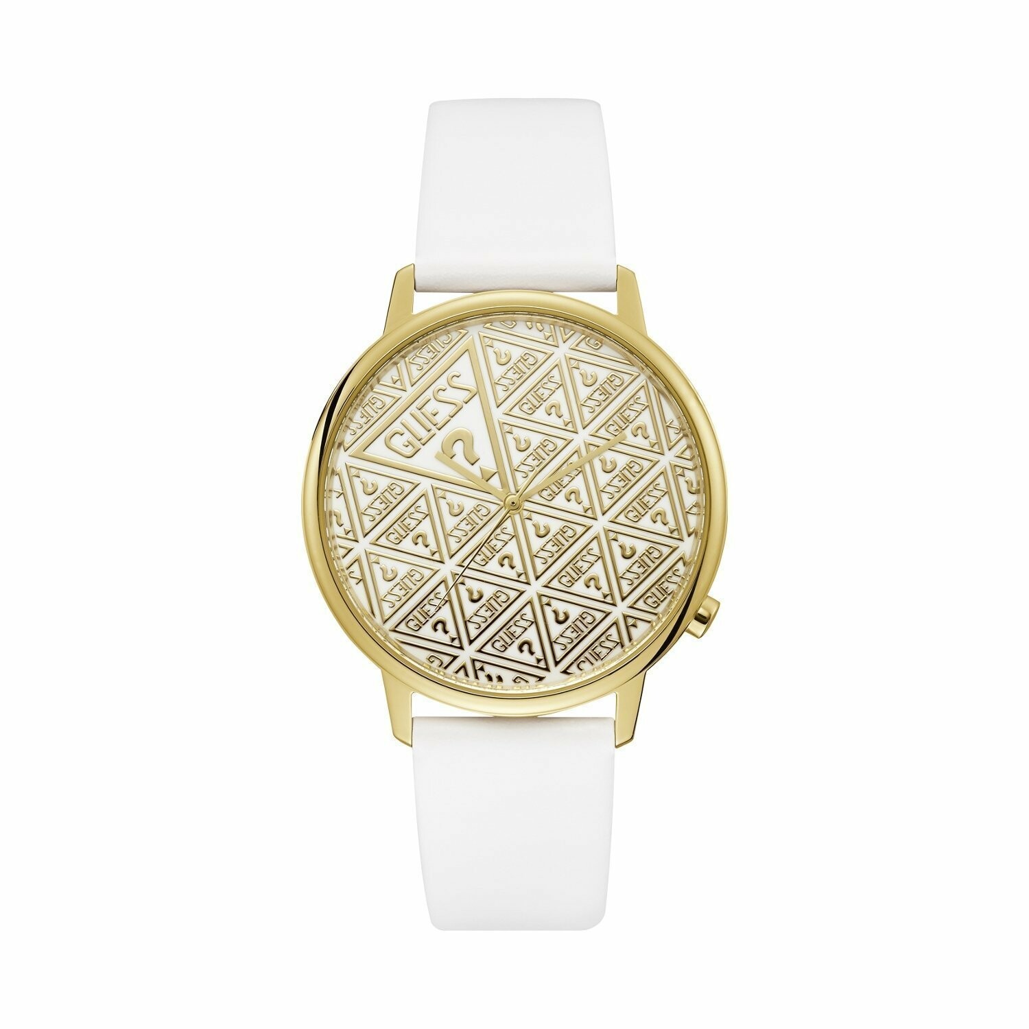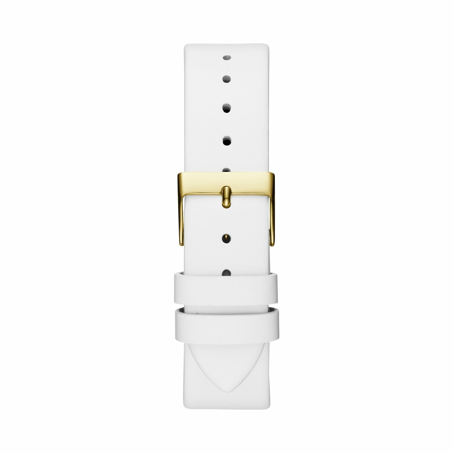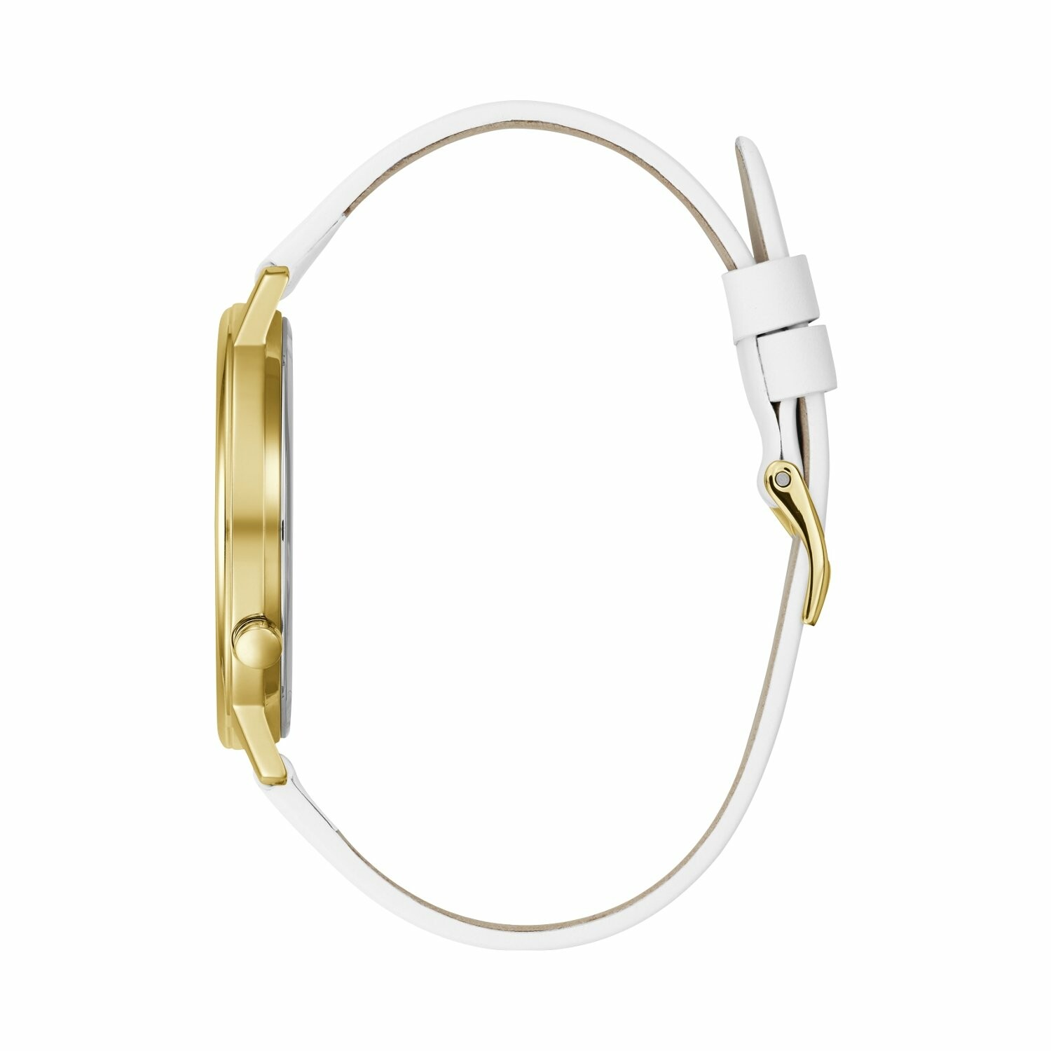 Boîtier acier doré brillant, cadran blanc avec logo GUESS doré, bracelet cuir blanc, étanche jusqu'à 30 mètres (3 ATM).