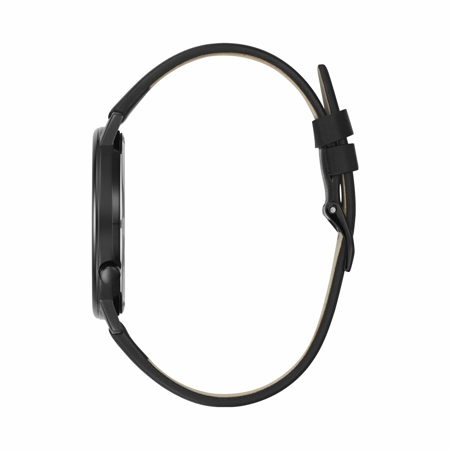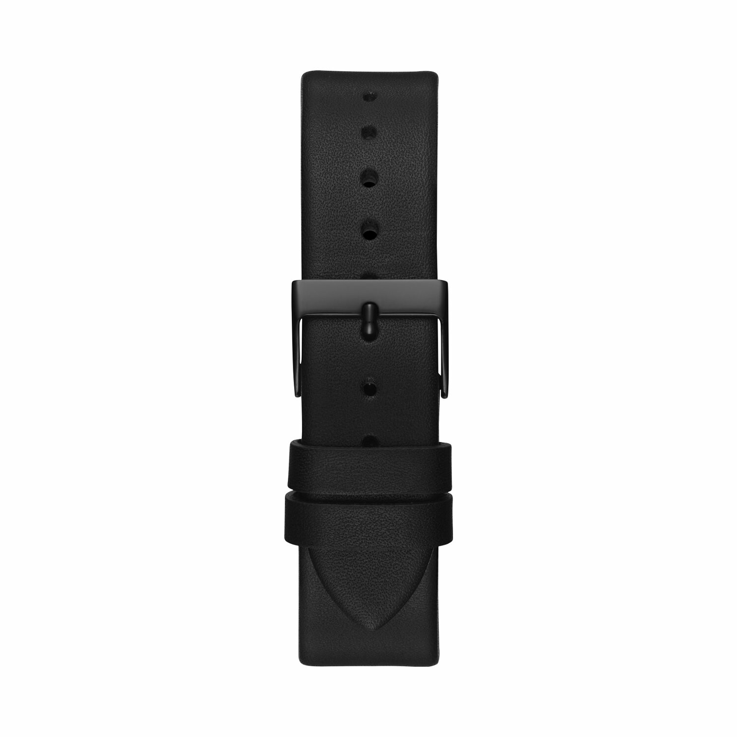 Boîtier acier noir brillant, cadran blanc avec logo GUESS noir, bracelet cuir noir, étanche jusqu'à 30 mètres (3 ATM).