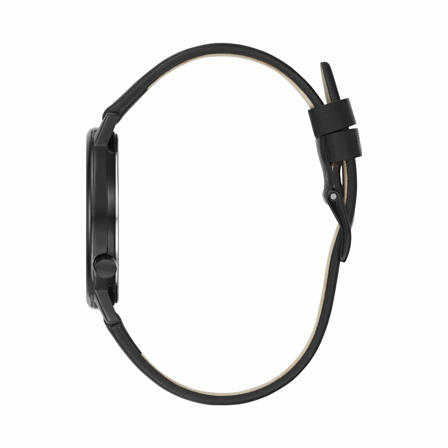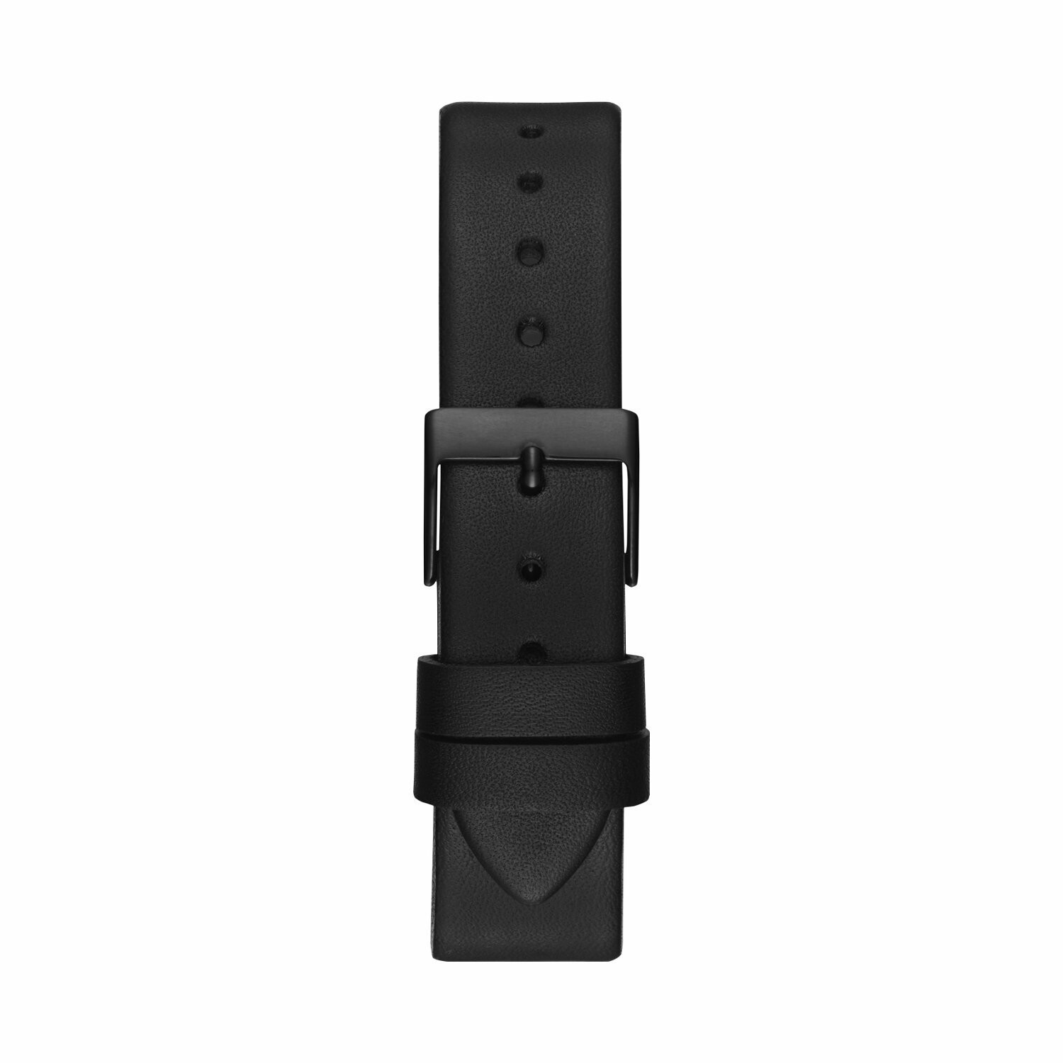 Boîtier acier noir brillant, cadran blanc avec logo GUESS noir, bracelet cuir noir, étanche jusqu'à 30 mètres (3 ATM).