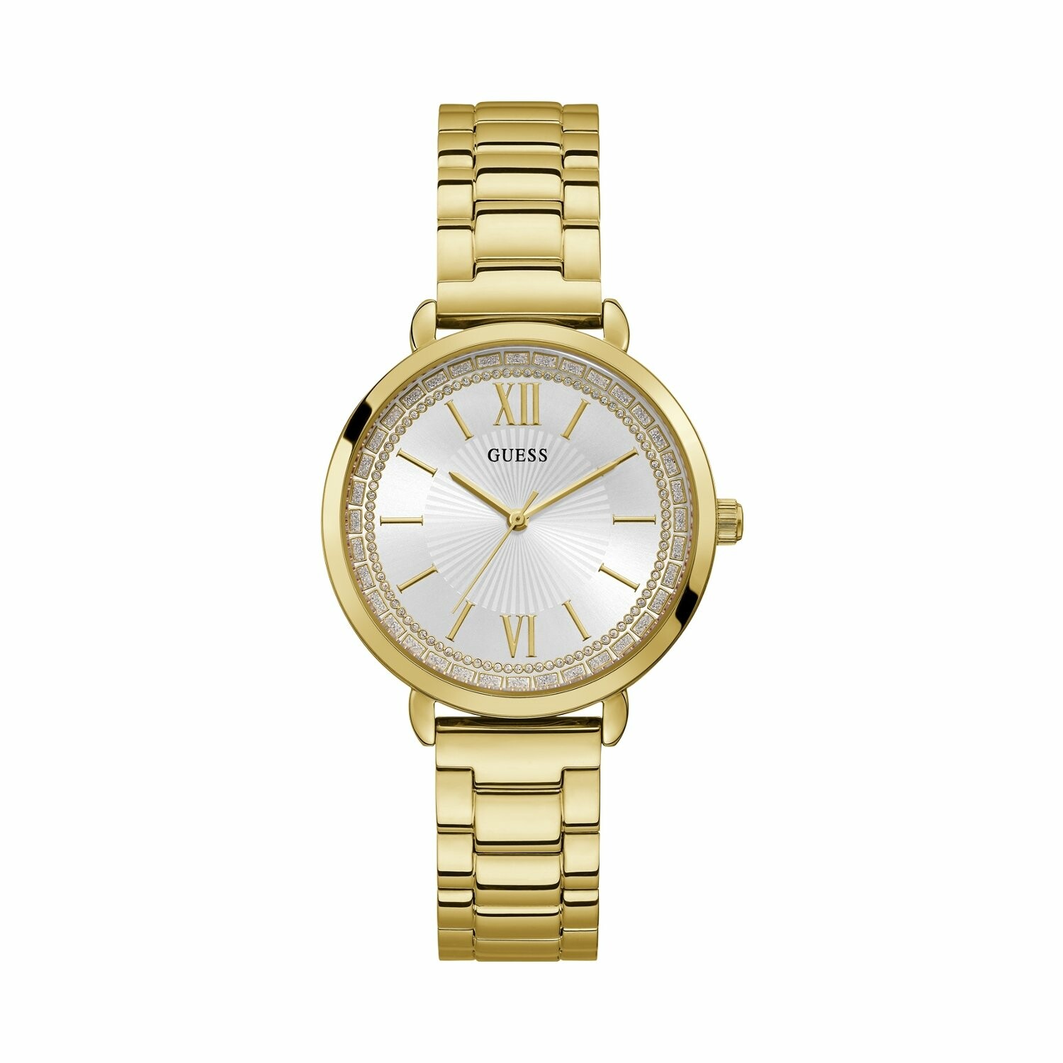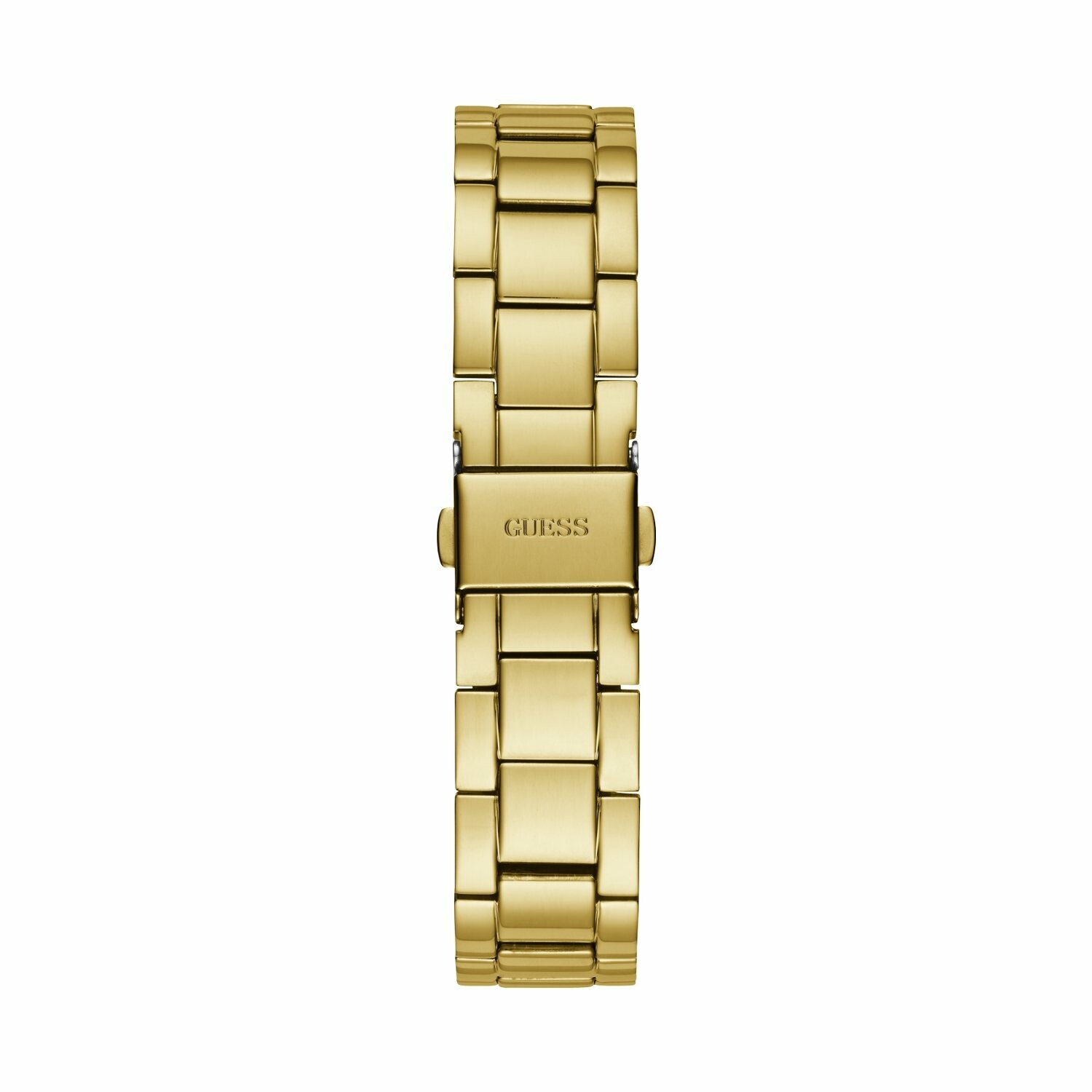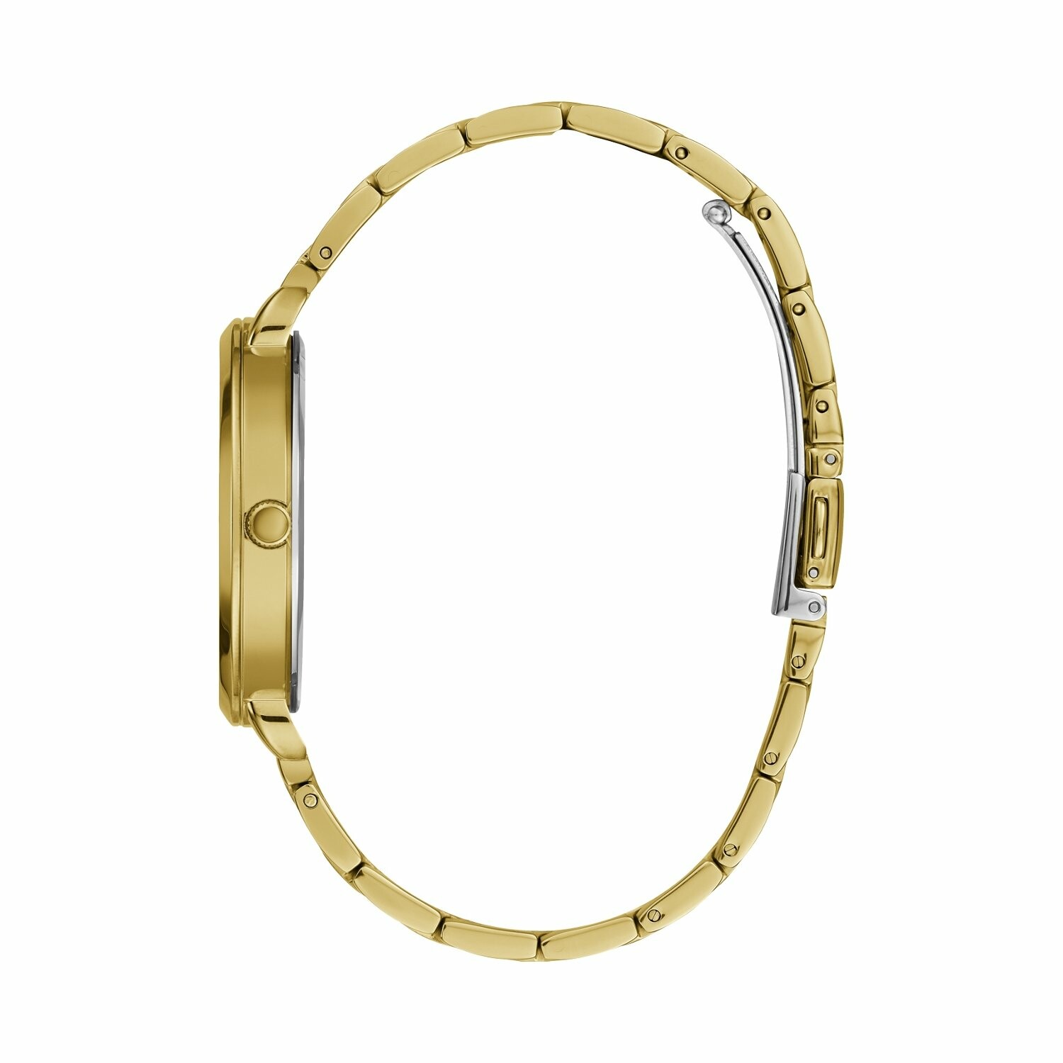 Boîtier acier doré brillant, cadran blanc pailleté, bracelet acier doré brillant, étanche jusqu'à 30 mètres (3 ATM).