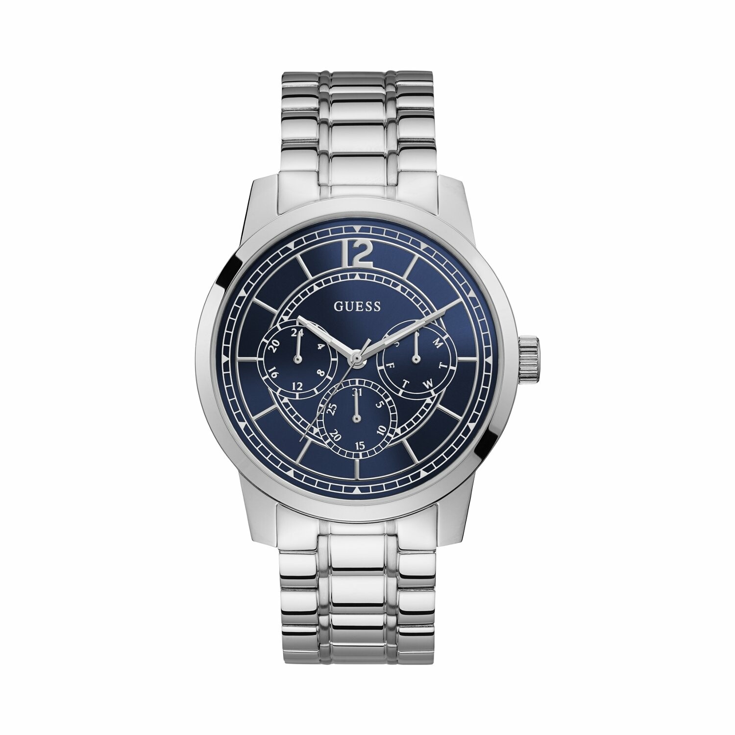 Boîtier acier brillant, cadran bleu, multifonction, bracelet acier brillant, étanche jusqu'à 50 mètres (5 ATM).