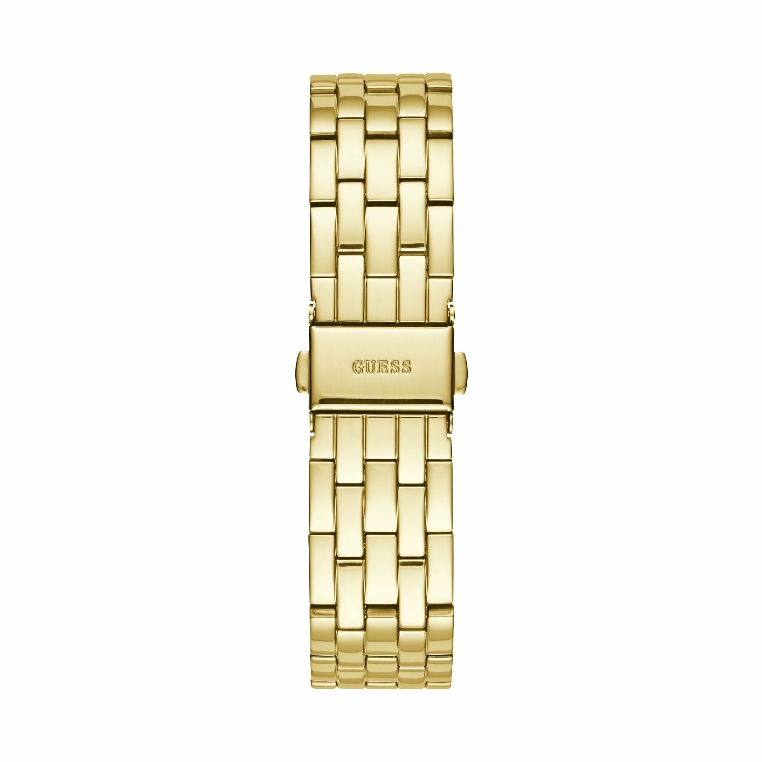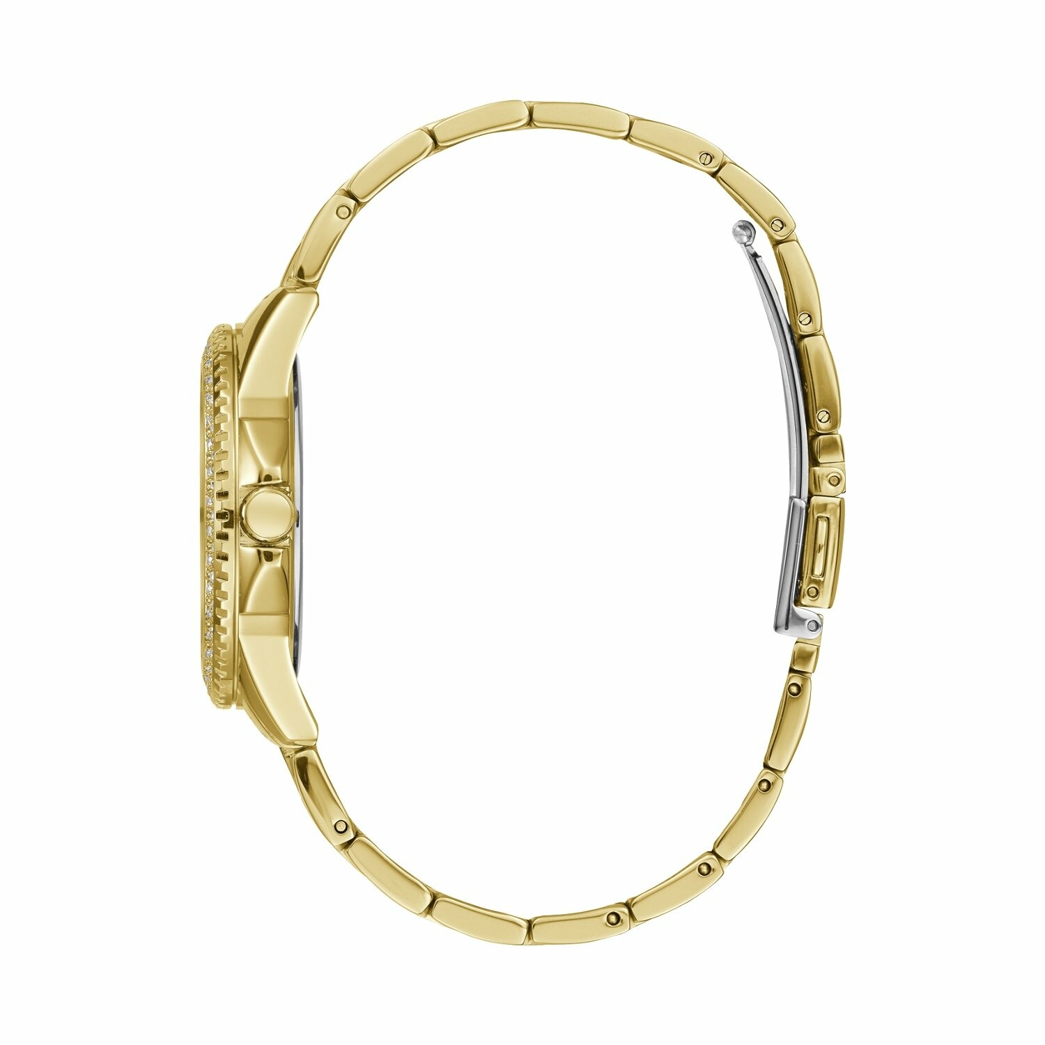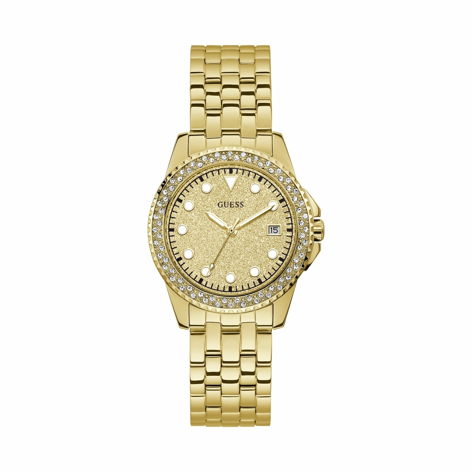 Boîtier acier doré brillant avec cristaux, cadran doré pailleté, dateur, bracelet acier doré brillant, étanche jusqu'à 50 mètres (5 ATM).
