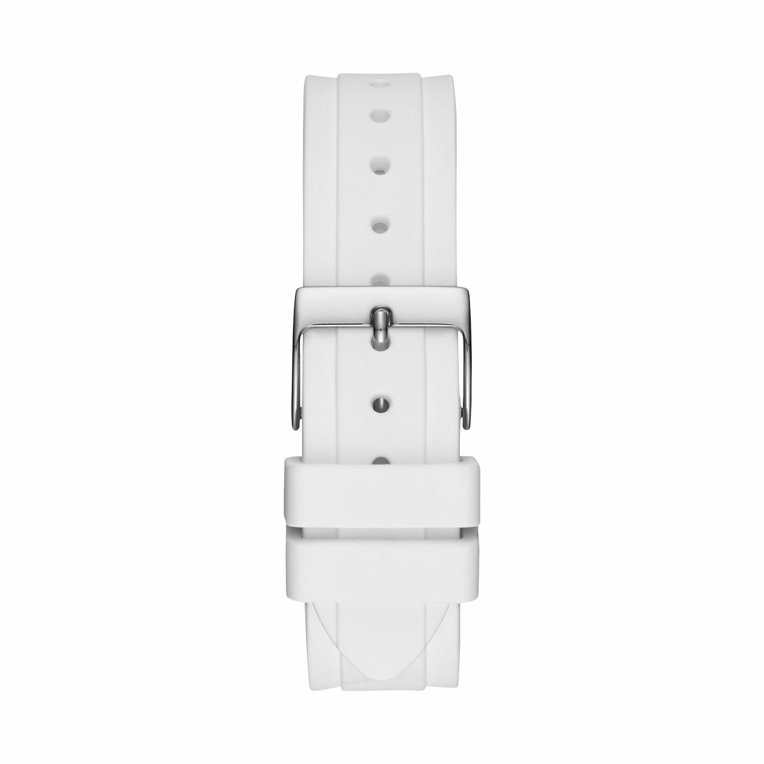 Boîtier acier brillant avec cristaux, cadran argenté, dateur, bracelet silicone blanc, étanche jusqu'à 50 mètres (5 ATM).